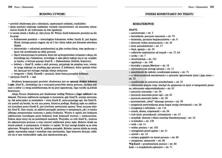 Wydanie Procesu kompletne bez skrótów i cięć w treści. W tym wydaniu znajdziesz odpowiedzi na pytania z podręcznika - pewniak na teście, czyli wskazanie zagadnień, które zwykle pojawiają się w pytaniach z danej lektury we wszelkich testach sprawdzających wiedzę, a także w podręcznikach i na klasówkach. Zawiera bardzo szczegółowe streszczenie oraz drugie skrócone, ułatwiające szybkie przygotowanie się przed lekcją. Opracowanie zawiera plan wydarzeń, wnikliwie wyjaśnioną problematykę oraz szerokie charakterystyki bohaterów.