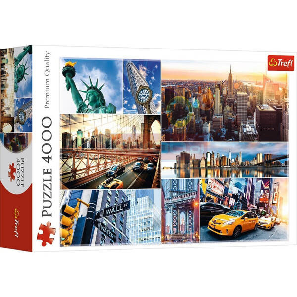 Puzzle 4000 elementów z kolażem wspaniałych zdjęć przedstawiających charakterystyczne miejsca Nowego Jorku - Manhattan, Wall Street, Statua Wolności. Po ułożeniu powstanie imponujący plakat o wymiarach 136x96 cm.