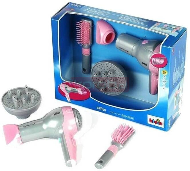 Dzięki zabawie suszarką Braun z dyfuzorem i szczotką, stylizuj i układaj fryzury jak prawdziwa fryzjerka! Suszarka dmucha powietrzem, ale nie nagrzewa się, dzięki czemu jest całkowicie bezpieczna w użytkowaniu przez dzieci. Zabawka stworzona jest na licencji firmy Braun i swoim wyglądem nawiązuje do urządzenia istniejącego w rzeczywistości. Zabawka jest nie tylko bezpieczna w użytkowaniu, ale sprawia również, że dziecko czuje się jakby korzystało z prawdziwej suszarki. Niemiecka firma Klein specjalizuje się w tworzeniu zabawek na licencji. Małe, plastikowe zabawki wyglądają niczym prawdziwe, elektroniczne urządzenia codziennego użytku. Kolekcja suszarek Klein na licencji Braun jest propozycją skierowaną głównie dla dziewczynek. Seria oferuje szeroką gamę produktów doskonale uzupełniających się na wzajem. Podczas zabawy dzieci mogą naśladować zaobserwowane w świecie dorosłych sytuacje. Zabawka wymaga użycia baterii, które nie są częścią tego zestawu.