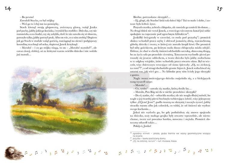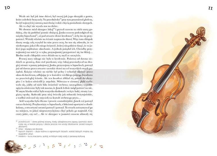 Janko Muzykant w serii Kolorowa Klasyka to najpiękniejsze kolorowe wydanie tej powieści na rynku! Książka zawiera wspaniałe, barwne ilustracje, jej atutem jest duża, ułatwiająca szybkie czytanie czcionka. Edycja na szlachetnym papierze, bardzo trwała i estetyczna.Bohater tej nowelki, Janko, to biedny wiejski chłopiec, który ma ogromny dar - talent muzyczny. Dziecko słyszy muzykę wszędzie, nawet w szumie wiatru i szeleście liści, a jego największym marzeniem jest posiadanie własnych skrzypiec. Niestety uboga wieś, na której żyje, nie rozumie tego i nie popiera, uważając chłopca za nieprzydatnego do niczego dziwaka... A wszystko to dzieje się tuż obok majątku szlacheckiego, którego mieszkańcy zachwycają się talentami włoskich dzieci.