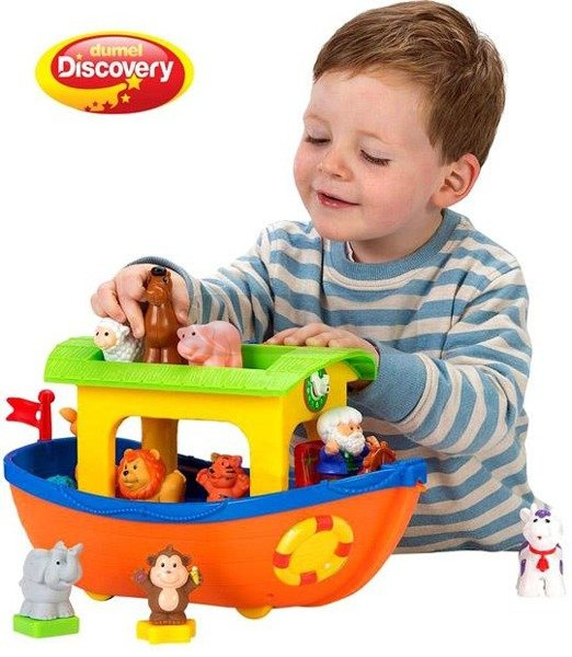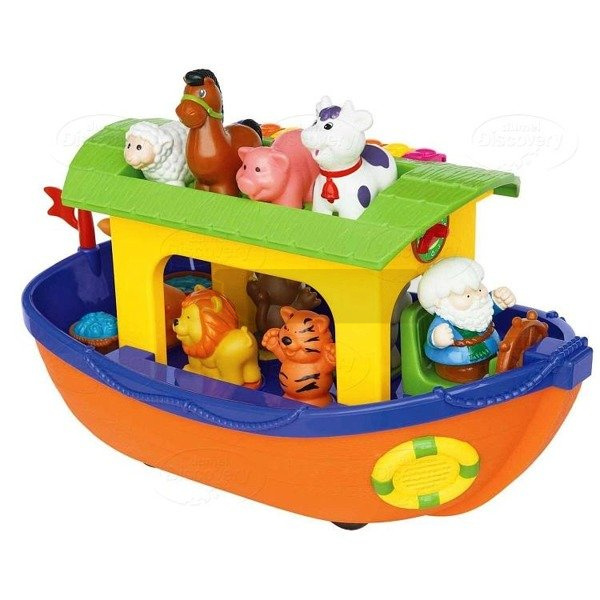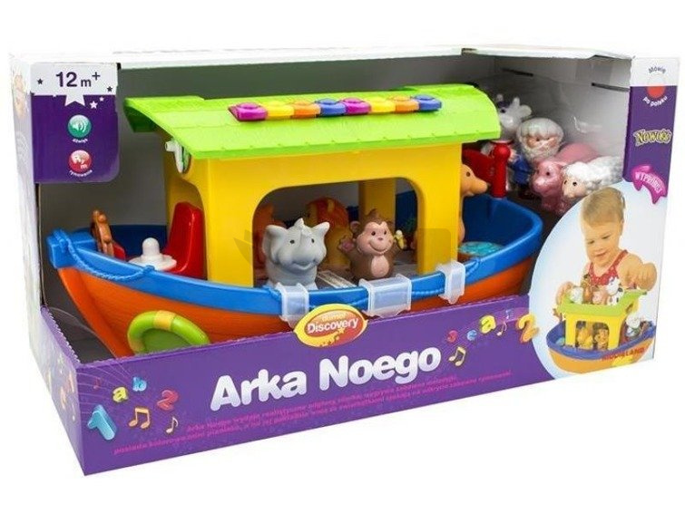Wspaniała arka Noego zawiera 9 zwierzątek, które nagrodzą dzieci realistycznymi odgłosami bądź zabawną rymowanką za każdym razem, kiedy odgadną prawidłowy kształt i włożą je w odpowiednie miejsce. Ster arki po przekręceniu wydaje realistyczne dźwięki. Zabawka posiada kolorowe mini pianinko, na którym można zagrać własną kompozycję. Istnieje możliwość doczepienia sznureczka do arki za pomocą którego może być prowadzona przez maluszka. Arka podczas jazdy imituje ruchy płynącej na falach łodzi. UWAGA! W zabawce znajdują się baterie testowe o małej pojemności, co może być przyczyną słabszego działania. Zaleca się wymianę na nowe, alkaliczne. Jeżeli zabawka nie funkcjonuje prawidłowo, należy wyłączyć zabawkę i włączyć ponownie. Jeśli problem nie ustąpi należy wymienić baterie na nowe. UWAGA! Baterie zawarte w zabawce są także przeznaczone do demonstracji w sklepie. Może się zdarzyć, że baterie się wyczerpią przed zakupem przez klienta i klient będzie musiał wymienić zawarte baterie na nowe w celu uzyskania poprawnego działania zabawki.