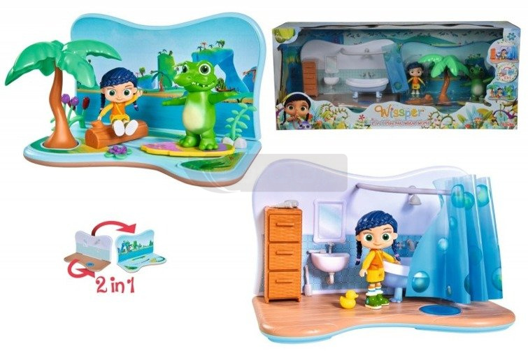 Wissper Zestaw 2w1 Wodny Świat Składany, dwustronny zestaw do odgrywania scenek z bajki. Po jednej stronie jest łazienka, z której bohaterka przenosi się do Wodnego Świata, a po przewróceniu - sceneria morska, z torem po którym porusza się figurka Kev'a na desce surfingowej.