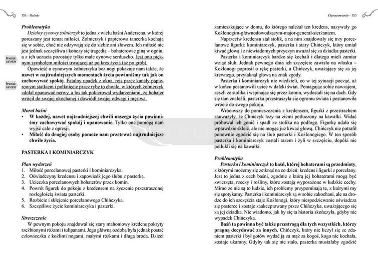 Wydanie Baśni kompletne bez skrótów i cięć w treści. W tym wydaniu znajdziesz odpowiedzi na pytania z podręcznika - pewniak na teście, czyli wskazanie zagadnień, które zwykle pojawiają się w pytaniach z danej lektury we wszelkich testach sprawdzających wiedzę, a także w podręcznikach i na klasówkach. Zawiera bardzo szczegółowe streszczenie oraz drugie skrócone, ułatwiające szybkie przygotowanie się przed lekcją. Opracowanie zawiera plan wydarzeń, wnikliwie wyjaśnioną problematykę oraz szerokie charakterystyki bohaterów.