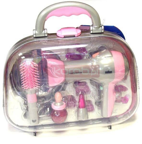 Zawiera lusterko, suszarkę, szczotkę, grzebień, i wiele innych akcesorii a to wszystko zamknięte w ślicznej walizce.