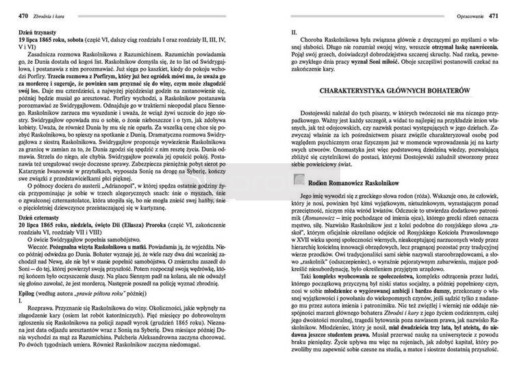 Wydanie Zbrodni i kary kompletne bez skrótów i cięć w treści. W tym wydaniu znajdziesz odpowiedzi na pytania z podręcznika - pewniak na teście, czyli wskazanie zagadnień, które zwykle pojawiają się w pytaniach z danej lektury we wszelkich testach sprawdzających wiedzę, a także w podręcznikach i na klasówkach. Zawiera bardzo szczegółowe streszczenie oraz drugie skrócone, ułatwiające szybkie przygotowanie się przed lekcją. Opracowanie zawiera plan wydarzeń, wnikliwie wyjaśnioną problematykę oraz szerokie charakterystyki bohaterów.
