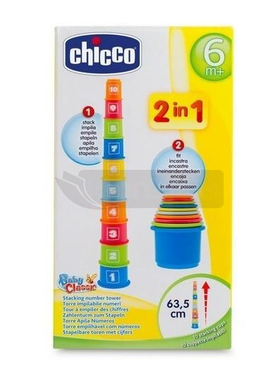 W zestawie jest 10 kolorowych, ponumerowanych kubeczków różnej wielkości. Dziecko ma za zadanie ułożyć je w kolejności od największego do najmniejszego (i jednocześnie od 1 do 10). Takie ćwiczenie pomaga dziecku trenować zdolność logicznego myślenia.
