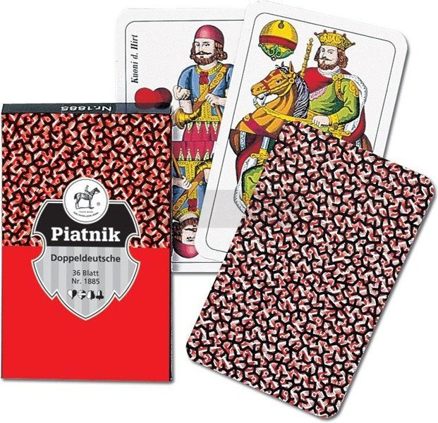 Najwyższej jakości karty do skata renomowanej firmy Ferd. Piatnik & Sohne. Bardzo popularne na Śląsku. Klasyczna talia 36 kart do skata (doppeldeutsche) z tradycyjnymi awersami i koszulkami typu "Blitz". Wyroby wiedeńskiej fabryki Ferd. Piatnik & Sohne od 1824 roku urzekają bogactwem wzorów i perfekcją wykonania. Jakość i tradycja!