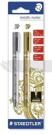 Marker do zdobienia i dekorowania. Do pisania po papierze, kartonie i wyschniętej masie Fimo air. Atrament pigmentowy do bazie wody. Usuwalny z gładkich powierzchni tj. szkło, lustro. Widoczny na jasnym i ciemnym papierze. Idealny do scrapbookingu i dekorowania kart okolicznościowych. Grubość linii pisania 1 2 mm. Okrągła końcówka. Dostępny pojedynczo (kolor złoty i srebrny), w zestawie na blistrze (2 kol: złoty i srebrny oraz 5 kolorów: złoty, srebrny, czerwony, niebieski i zielony)
