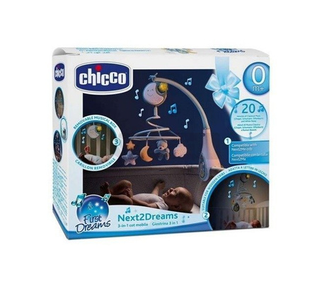 Karuzela z zabawkami Next2Dreams z serii Chicco First Dreams to pierwsza karuzela zaprojektowana specjalnie do montażu na łóżeczkach Next2Me, a także większości drewnianych łóżek dziecięcych. Karuzela towarzyszy dziecku w rytuale wieczornym, wprowadzając je w stan relaksu, wyciszenia i spokojnego zapadania w sen. To wszystko dzięki efektom, które są elementem zabawki: dźwięki muzyki, biały szum i delikatne oświetlenie.