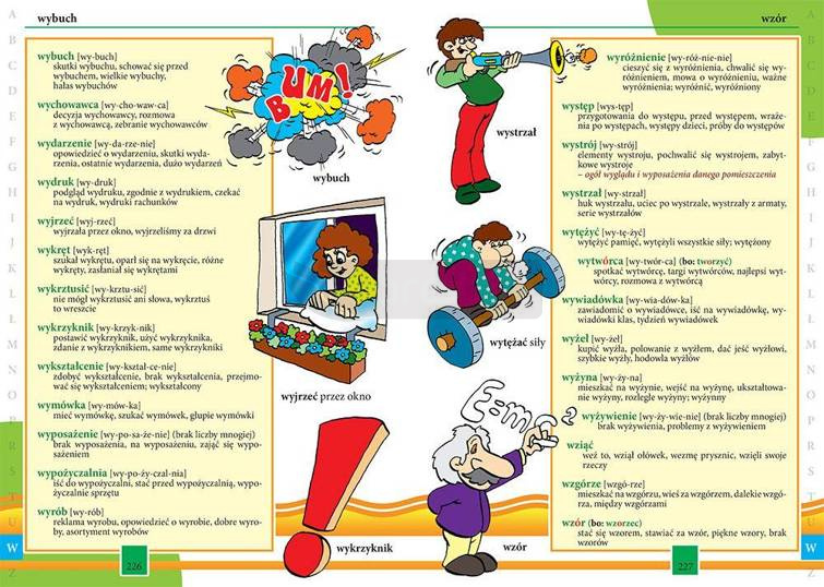 Ilustrowany słownik ortograficzny zawiera przystępnie opisane reguły ortograficzne, dzięki którym każde dziecko z łatwością zapamięta najważniejsze zasady, wyjątki i przykłady. Słownik zawiera ponad 30 000 słów, a każda ze stron ozdobiona jest barwnymi, zabawnymi ilustracjami, dzięki którym sprawdzanie słówek w słowniku i nauka ortografii staną się niesamowitą przygodą! Ilustrowany słownik ortograficzny jako jedyny na rynku posiada hasła z podziałem na sylaby. Słówka opatrzone zostały odmianą całych wyrazów, a najtrudniejsze z nich wyjaśniono w przystępny dla dziecka sposób. Słowniczki są polecane przez nauczycieli i metodyków pracujących z dziećmi. Atrakcyjna graficznie i niezwykle trwała twarda oprawa sprawi, że słownik będzie służył dzieciom przez lata!