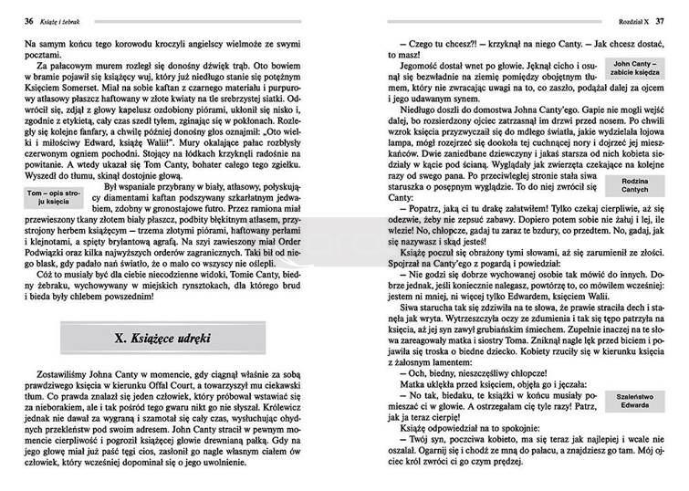 Wydanie Księcia i żebraka kompletne bez skrótów i cięć w treści. W tym wydaniu znajdziesz odpowiedzi na pytania z podręcznika - „pewniak na teście”, czyli wskazanie zagadnień, które zwykle pojawiają się w pytaniach z danej lektury we wszelkich testach sprawdzających wiedzę, a także w podręcznikach i na klasówkach. Zawiera bardzo szczegółowe streszczenie oraz drugie skrócone, ułatwiające szybkie przygotowanie się przed lekcją. Opracowanie zawiera plan wydarzeń, wnikliwie wyjaśnioną problematykę oraz szerokie charakterystyki bohaterów.