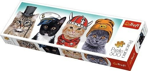 Puzzle 500 elementów z wizerunkiem czterech puszystych, przebranych kotów. Po ułożeniu powstanie obrazek o wymiarach 66 x 23.7 cm. Wysoką jakość, nasycenie kolorów i bezpieczeństwo układania zapewnia kalandrowany papier odbijający światło, pokryty ekologicznymi farbami spożywczymi.