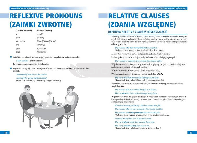 Zawiera przegląd wszystkich zagadnień gramatycznych, przedstawionych zwięźle, prosto i zrozumiale, z łatwymi do zapamiętania i sensownie objaśnionymi przykładami. Są tutaj informacje o czasach gramatycznych i ich zastosowaniu, okresach warunkowych, stronie biernej, czasownikach modalnych, najważniejsze czasowniki nieregularne ze wszystkimi formami, a także tematy związane z częściami mowy.