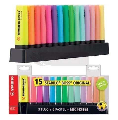 Numer 1 na świecie! Niedościgniony klasyk od 1971 roku. W każdej sekundzie sprzedają się 2 zakreślacze BOSS w Europie. Zakreślacz fluorescencyjny z tuszem na bazie wody do pisania na wszystkich rodzajach papieru (również faksowym i samokopiującym). Pozostawiony bez skuwki nie zasycha nawet przez 4 godziny, a po zamknięciu ma właściwości regeneracyjne. Jedyny zakreślacz dostępny aż w 15 kolorach. Szerokość linii od 2 do 5 mm. Plastikowe opakowanie na biurko zawierające wszytski 15 kolorów zakreślacza