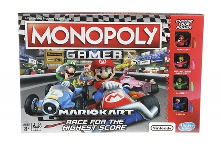 Monopoly łączy siły z Nintendo już po raz drugi, oto Monopoly Gamer Mario Kart! Kultowa gra z konsoli Nintendo przenosi się do świata Monopoly! Wybierz jedną z kilku kultowych postaci Mario Kart i ścigaj się po planszy, kupując takie nieruchomości, jak zamek Bowsera czy Tęczowy Szlak! Pamiętaj, że panują tu zasady znane z gier Mario Kart, więc będziesz musiał uważać na skórki od banana oraz próbować trafić przeciwników skorupami żółwia! Zbieraj karty Grand Prix i spróbuj uzyskać jak najwięcej monet. A gdy ostatni wyścig dobiegnie do końca, gracz posiadający najwyższy wynik, wygrywa grę!