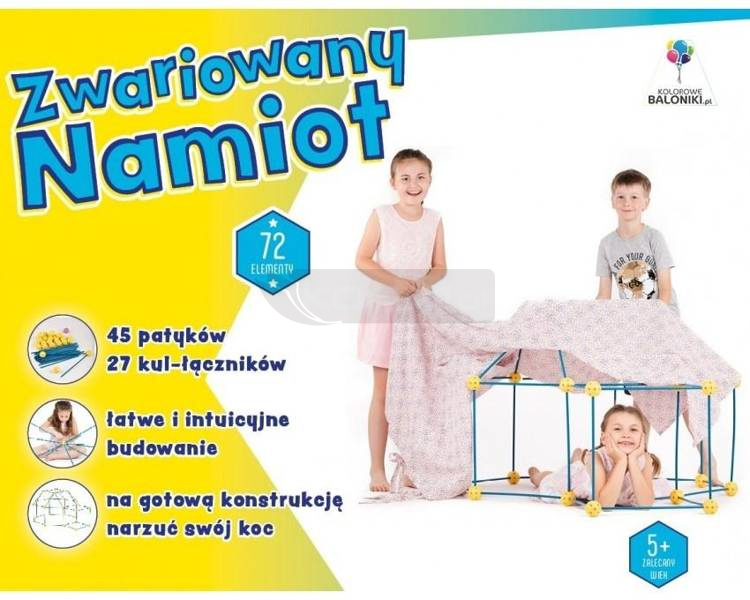 Zwariowany Namiot to zabawka konstrukcyjna z której można w łatwy i szybki sposób budować duże, wytrzymałe, łatwe do przenoszenia, świetne w zabawie kompozycje jak igloo, domek, zamek, wieża, tunel, które można przykryć kocem lub innym materiałem. Konstrukcje są tak duże, że dzieci mogą się w nich bawić.