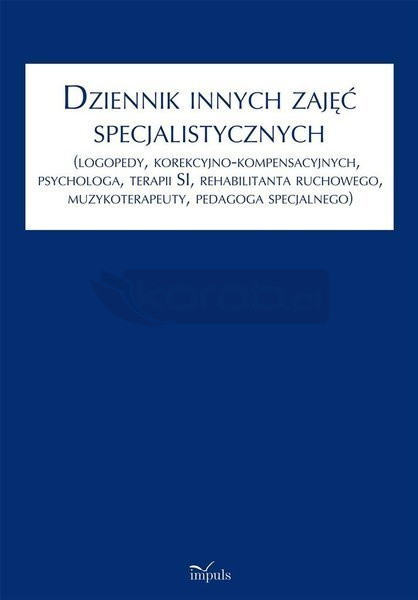 Dziennik przygotowany jest w formacie A4 ze skrzydełkiem na którym wpisujemy imiona i nazwisko objętości 140 stron na których do Państwa wykorzystania są opracowane: tygodniowy rozkład zajęć, informacje o wychowankach, wykaz obecności dzieci na zajęciach, plan pracy, podstawa zakwalifikowania na zajęcia (diagnoza), indywidualny program terapii, analiza postępów dziecka, zalecenia do dalszej pracy, realizacja programu zajęć, kontakty z rodzicami, nauczycielami, poradniami specjalistycznymi, inne, hospitacje, uwagi i notatki.
