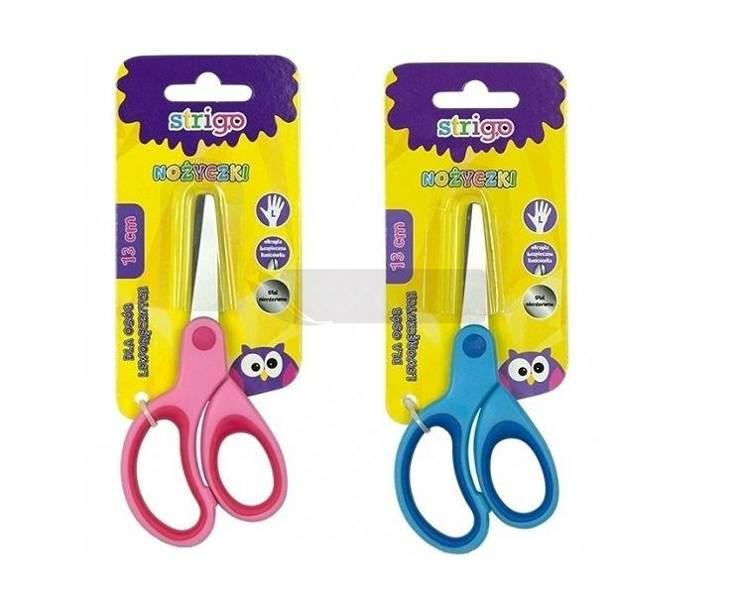 Nożyczki dla leworęcznych 13cm szkolne Strigo Nożyczki szkolne zaprojektowane zostały z myślą o dzieciach leworęcznych. Posiadają bezpieczne, łagodnie zakończone końcówki. Dzięki gumowym uchwytom są bardzo wygodne i komfortowe w użytkowaniu. Ostrza zostały wykonane ze stali nierdzewnej. Dostępne kolory nożyczek: niebieskie, różowe. wzór wysyłany losowo!