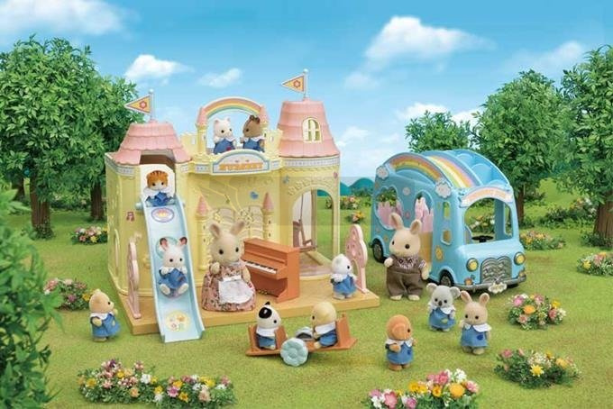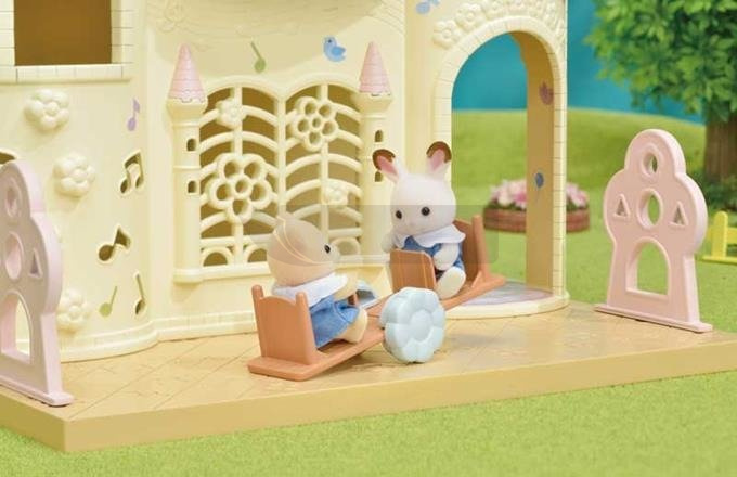 W zamkowym przedszkolu Sylvanian Families wszystkim dzieciom z rodziny Sylvanian dopisuje humor. Tutaj maluchy mogą szaleć i bawić się cały dzień. Mogą się huśtać, bujać i zjeżdżać na zjeżdżalni. Huśtawkę rownoważnię można przekształcić w stół z dwoma taboretami, przy którym dzieci mogą czytać książki. Zjeżdżalnię można przymocować do zewnętrznej ściany lub ustawić osobno na stojakach. Przedszkole „Zamek” z serii Sylvanian Families ma dwa piętra pełne niespodzianek. Dzieci mogą również uczestniczyć w lekcji muzyki przy fortepianie. Domek można ustawiać na platformie w różnych pozycjach, dzięki czemu jest więcej miejsca na zabawę w środku lub na terenie przed przedszkolem. Chorągiewki, wieżyczki i wnętrze są uroczo ozdobione licznymi detalami. W zestawie jest przedszkole „Zamek”, zjeżdżalnia, huśtawka, fortepian, huśtawka wagowa z możliwością zmiany w stół z taboretami i inne akcesoria.