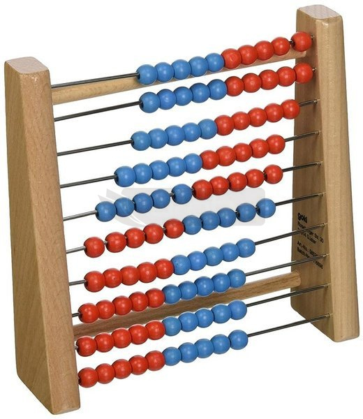Liczydło drewniane z metalowymi prętami. 100 kulek w dwóch kolorach: czerwony i niebieski.