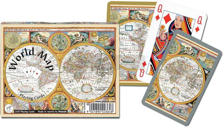 Najwyższej jakości karty do gry renomowanej firmy Ferd. Piatnik & Sohne. W popularnym komplecie 2 talie w eleganckim, złoconym pudełku z charakterystyczną Piatnikowską poduszeczką, a całość w oprawie starej mapy świata. Dla podróżników i nie tylko. Talie składają się z 55 plastikowanych kart o wymiarach 58 x 89 mm i gramaturze 310. Idealne zarówno do brydża, pokera, remika jak i innych gier. Wyroby wiedeńskiej fabryki Ferd. Piatnik & Sohne od 1824 roku urzekają bogactwem wzorów i perfekcją wykonania. Jakość i tradycja!
