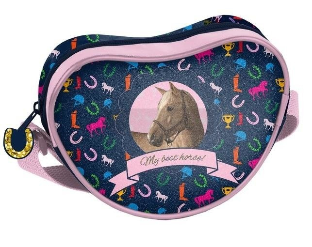 Torebka na ramię, jedna kieszeń zamykana na zamek, kształt serduszka, regulowany pasek. Ozdobne brokatowe dodatki na froncie. Materiał polyester 300x300D. Rozmiar 18x14x5 cm