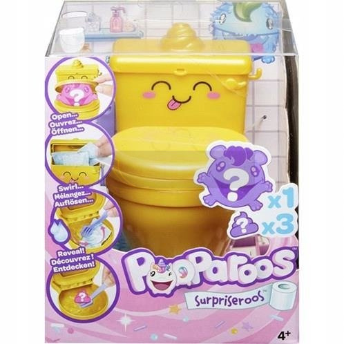 Te niezwykle urocze, zabawkowe toalety są pełne niespodzianek, które sprawiają, że zabawa przynosi mnóstwo radości! By odkryć pierwszą niespodziankę, otwórz toaletę i sprawdź, które z mięciutkich, słodkich stworzonek Pooparoos Surpriseroos ukrywa się w środku istnieje wiele możliwości. Możesz trafić na potworka, jednorożca, króliczka i wiele innych postaci! Niespodzianka numer dwa znajduje się w zbiorniku zajrzyj do niego i wyciągnij trzy magiczne pakunki. Wlej wodę do sedesu, wrzuć papierowy pakunek i pomieszaj dołączoną do zestawu łyżeczką. Papier rozpuści się na Twoich oczach i zobaczysz wówczas jedzonko dla Twojego pupila! Wyciągnij je za pomocą łyżeczki, nakarm swoje stworzonko Pooparoos, posadź je na toalecie i ściskaj, ściskaj, ściskaj... a jedzonko znów znajdzie się w sedesie! Ta zabawa nigdy się nie kończy. Możesz karmić swoje zwierzątko i ściskać je wielokrotnie, bez końca, pomagając im pozbyć się jedzonka! Pooparoos Surpriseroos to całkowicie unikalne, zabawne zestawy do zabawy, które doskonale sprawdzą się jako wyjątkowe prezenty. Przechowuj uroczą figurkę Pooparoos w dołączonej toalecie, a jego jedzenie w zbiorniku, gdzie będą czekać na Ciebie i kolejną porcję zabawy.