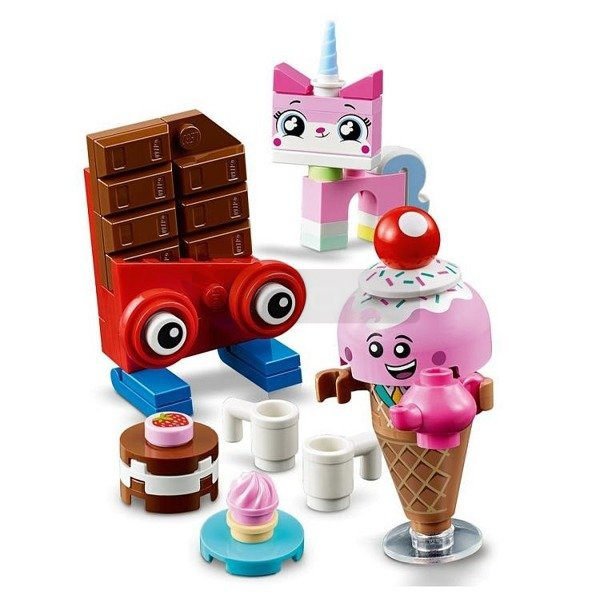 Zestaw LEGO z Kicią Rożek zawiera trzy figurki postaci z filmu LEGO PRZYGODA 2 do zbudowania z klocków: Kicię Rożek, Wafla-Wafla i Czekoladnika oraz wózek.