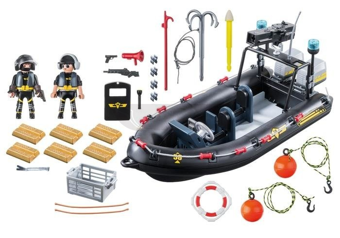 Funkcjonariusze jednostki specjalnej to brawurowi, odważni i świetnie wyszkoleni agenci, których praca jest bardzo niebezpieczna, a niejednokrotnie zagraża życiu czy zdrowiu. Funkcjonariusze biorą udział w tajnych misjach i skomplikowanych operacjach, rozbijając grupy przestępcze czy zwalczając terroryzm. Nic więc dziwnego, że muszę wyposażyć się w specjalistyczny sprzęt i ekwipunek. Czy widziałeś kiedyś ponton jednostki specjalnej? Na jego pokładzie może podróżować dwóch agentów. Z tyłu doczepiono silnik, by umożliwić jak najszybsze dotarcie na miejsce. Na stelażu zainstalowano niebieskie reflektory, których użyjemy w awaryjnej sytuacji, np. podczas pościgu. Co więcej, tu także zamontowano działko na pociski, dzięki którym ostrzelamy wrogie jednostki pływające lub pojazdy na brzegu. Funkcjonariuszom przydadzą się także pływające bojki, lina, harpun, megafon i broń z dodatkową amunicją. Na pokładzie pontonu agenci przewożą skrzynię ze złotem, której muszę pilnować jak oka w głowie i przez którą mogą paść ofiarą przestępców. Wspomóż agentów i przetransportuj kruszec w bezpieczne miejsce!