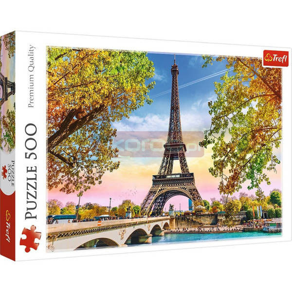 Puzzle 500 elementów z widokiem na Wieżę Eiffla. Po ułożeniu powstanie obrazek o wymiarach 48 x 34 cm. Wysoką jakość, nasycenie kolorów i bezpieczeństwo układania zapewnia kalandrowany papier odbijający światło, pokryty ekologicznymi farbami spożywczymi.