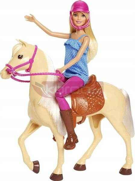 Ten zestaw z lalką i konikiem Barbie® pozwala wyobraźni „pogalopować”! Koń dołączony do zestawu ma siodło i uzdę, aby ta dwójka przyjaciół mogła wyruszyć razem na poszukiwanie przygody. Posadź lalkę na koniu i ruszaj przed siebie! Barbie® ma na sobie strój jeździecki z butami i kaskiem, a jej kolana się zginają, aby mogła usiąść na koniku. Dzieci pokochają wspólne „przejażdżki” z tą dwójką przyjaciół, bo gdy dziewczynki bawią się z Barbie®, odkrywają, że mogą być kim chcą! W zestawie lalka Barbie® w ubranku, koń ze zdejmowaną uzdą i siodłem oraz kask dla lalki.