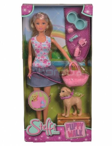 Steffi na spacerze z suczką i szczeniaczkiem w stylowej torbie. Ubrana w sportową sukienkę i traperki. Zestaw zawiera akcesoria dla piesków.