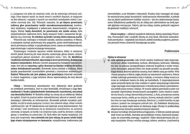 Wydanie noweli Rozdziobią nas kruki, wrony... kompletne bez skrótów i cięć w treści. W tym wydaniu znajdziesz odpowiedzi na pytania z podręcznika - "pewniak na teście", czyli wskazanie zagadnień, które zwykle pojawiają się w pytaniach z danej lektury we wszelkich testach sprawdzających wiedzę, a także w podręcznikach i na klasówkach. Zawiera bardzo szczegółowe streszczenie oraz drugie skrócone, ułatwiające szybkie przygotowanie się przed lekcją. Opracowanie zawiera plan wydarzeń, wnikliwie wyjaśnioną problematykę oraz szerokie charakterystyki bohaterów.