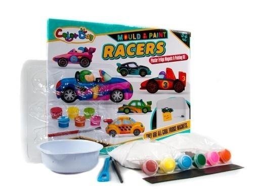 Dzięki specjalnym foremkom w kształcie autek i dołączonych farbek dzieci stworzą różne rodzaje pojazdów. Jeżeli dołączy się do nich magnesy są idealną ozdobą na lodówkę.