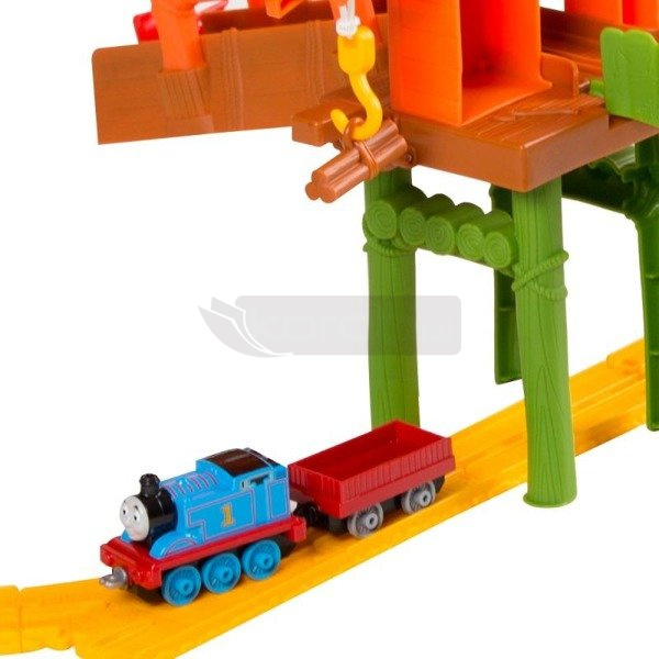 W zestawie Tomek, wagon towarowy i element ładunku. Metalowa lokomotywka Tomek i wagon towarowy z ładunkiem „drewnianego” bala. Akcesorium w postaci tyrolki Dźwig z hakiem, który podnosi, opuszcza i przywraca tyrolkę na swoje miejsce. Tartak z „obrotową” piłą. Plastikowe łączniki pozwalają dołączać inne lokomotywy, wagony towarowe lub tendery.