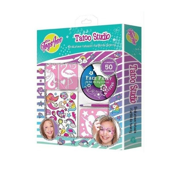 Zestaw do malowania twarzy, idealny na imprezę dla dzieci. Każdy animator bez problemu stworzy piękny tatuaż, dzięki dołączonym szablonom oraz brokatowym tatuażom. Farbki do twarzy w 5 kolorach (biały, niebieski, różowy, fioletowy i zielony), 3 szablony, 45 brokatowych tatuaży, 1 pędzelek. Zestaw od 6 roku życia.