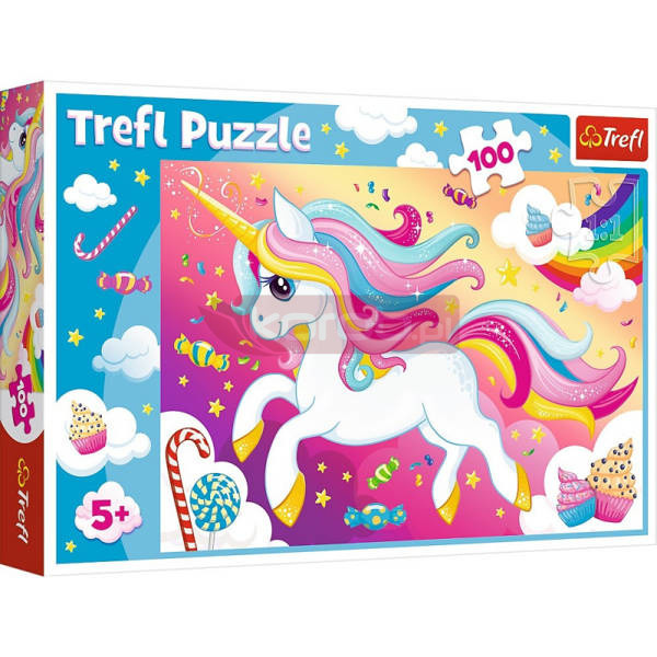 Puzzle 100 elementów z pięknym jednorożcem. Po ułożeniu powstanie obrazek o wymiarach 41x27,5 cm. Wysoką jakość, nasycenie kolorów i bezpieczeństwo układania zapewnia kalandrowany papier odbijający światło i wykorzystanie materiałów ekologicznych.