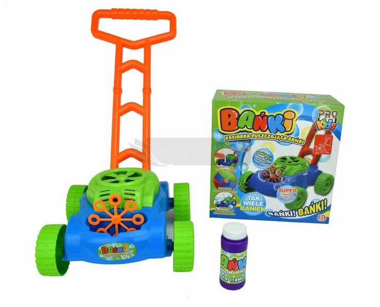 Kosiarka łącząca przyjemność naśladowania pracy dorosłych z radosnym puszczaniem baniek. Kosiarka puszczająca bańki na baterie, w zestawie płyn do baniek. Do kosiarki wystarczy wlać dołączony płyn i nacisnąć przycisk Przycisk włącza i wyłącza mechanizm puszczania baniek 45 x 30 x 28 cm