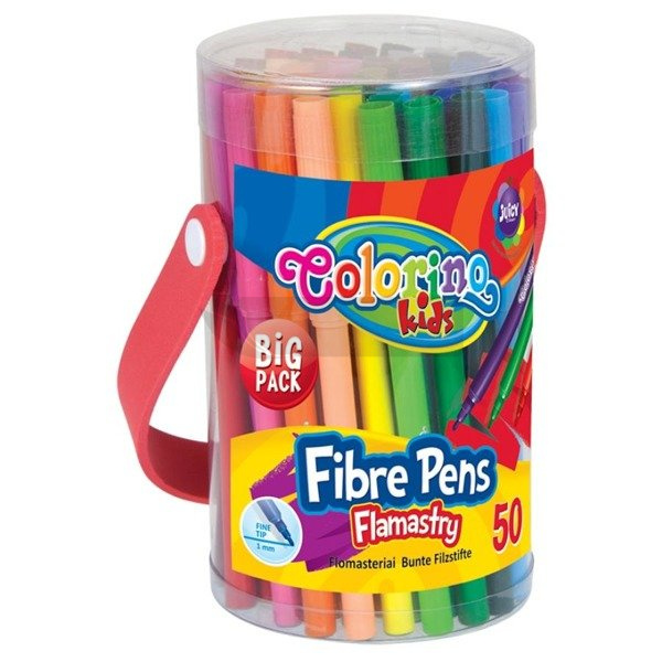 Klasyczne flamastry „Duża Paczka”z cienką 2 mm końcówką, 50 szt. w zestawie. Idealne do rysowania precyzyjnych kształtów lub pisania. Zapakowane w plastikową tubę z rączka, ułatwiającą przechowywanie i przenoszenie. Wysokiej jakości tworzywo, wentylowana skuwka, zmywalny tusz.