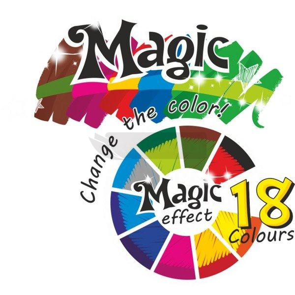 Zmieniające kolor flamastry. Zestaw zawiera 9 flamastrów + 1 „magiczny”, który - jak czarodziejska różdżka – zmieni kolor rysunku. Wystarczy pomalować kartkę, a następnie użyć „magicznego” flamastra, który zmieni kolor: czarny na czerwony, brązowy na zielony, ciemnozielony na jasnozielony, niebieski na szary, granatowy na niebieski, fioletowy na granatowy, ciemnoróżowy na jasnoróżowy, czerwony na pomarańczowy i pomarańczowy na żółty.