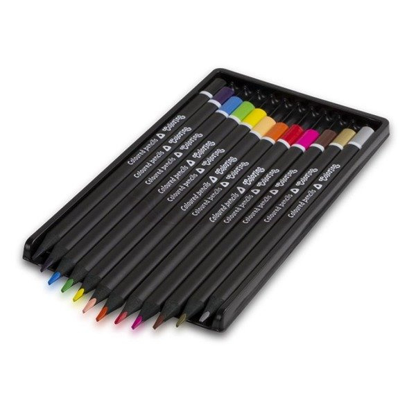 Wysokiej jakości miękki rysik oprawiony w czarne drewno, z matowym wykończeniem. Każda kredka zakończona kolorową końcówką wskazującą kolor rysika. Dodatkowym atutem zestawu jest kredka złota i srebrna. W zestawie znajduje się również temperówka.