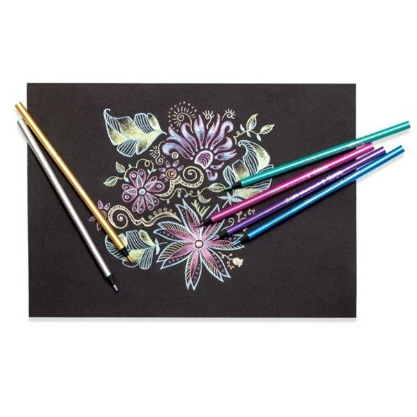 Wysokiej jakości okrągłe kredki w 10 metalicznych kolorach z czarnego drewna. Idealny zestaw do efektownego wykończenia rysunku. Metaliczny połysk najlepiej jest osiągnąć rysując na czarnym kartonie.