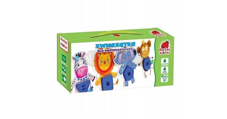 Słoniątko, małpeczka, lew i zebra zapraszają malucha do wspólnej nauki figur geometrycznych.