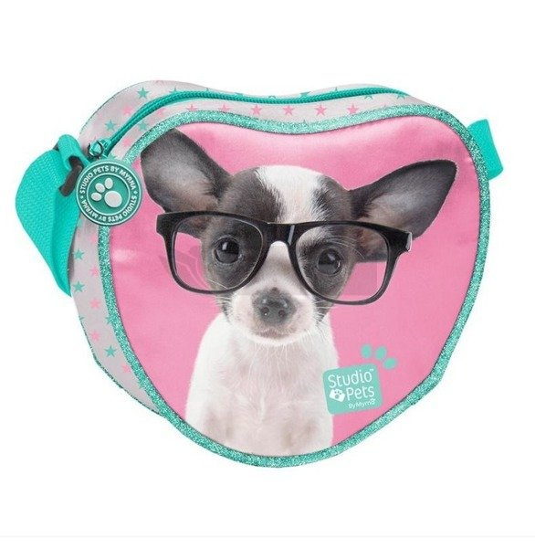 Torebka Studio Pets chihuahua w okularach w kształcie serduszka. Torebka posiada pasek na ramię z regulowaną długością.