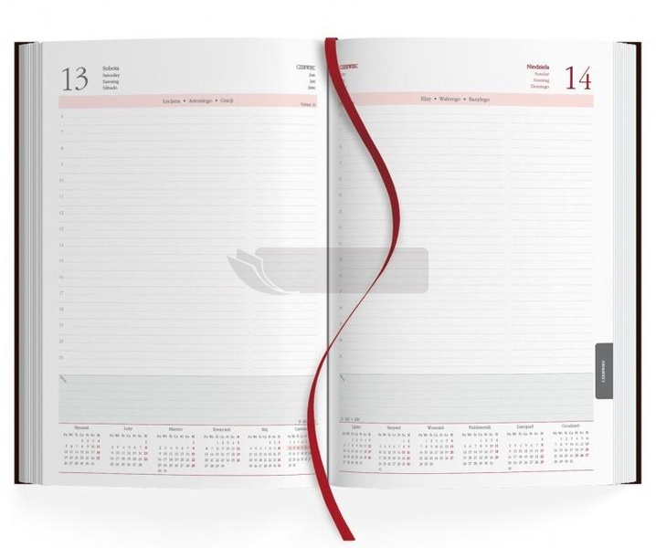 w języku polskim, angielskim, niemieckim, hiszpańskim, numeracja dni i tygodni, potrójne imieniny, perforacja narożników