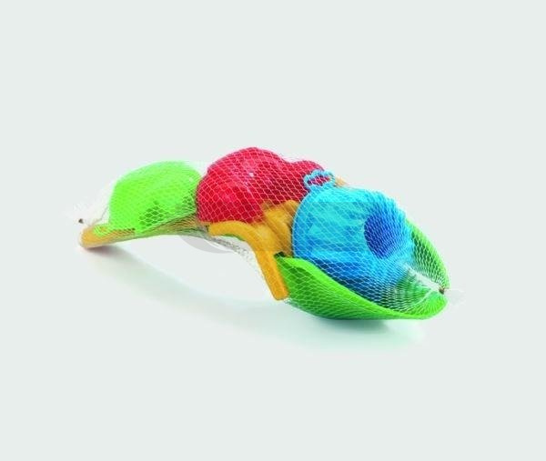 W zestawie 5 elementów: łopatka, grabki, 3x foremka