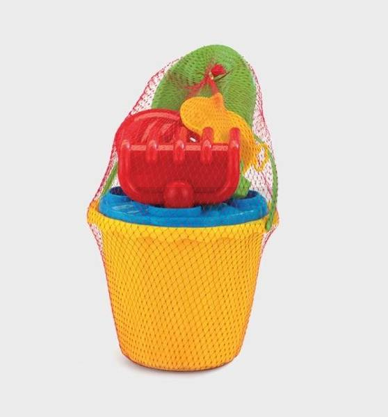 W zestawie 7 elementów: wiaderko, sitko, grabki, łopatka, 2x foremki.