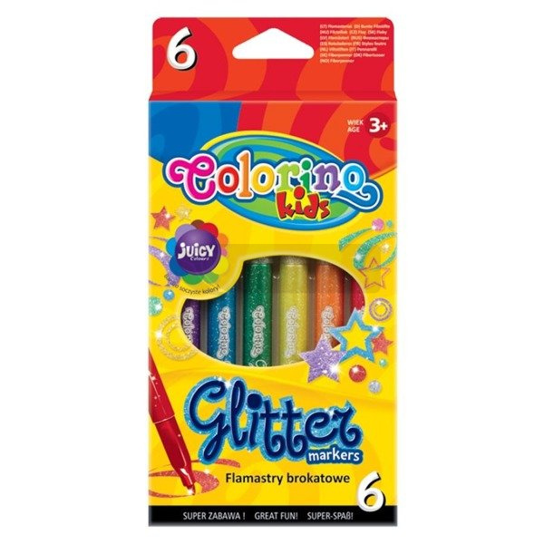 Flamastry brokatowe w 6 kolorach. Bardzo duża zawartość drobinek brokatu. Intensywne kolory, pięknie się błyszczą białych i kolorowych powierzchniach. Wspaniale ozdobią każdy rysunek.