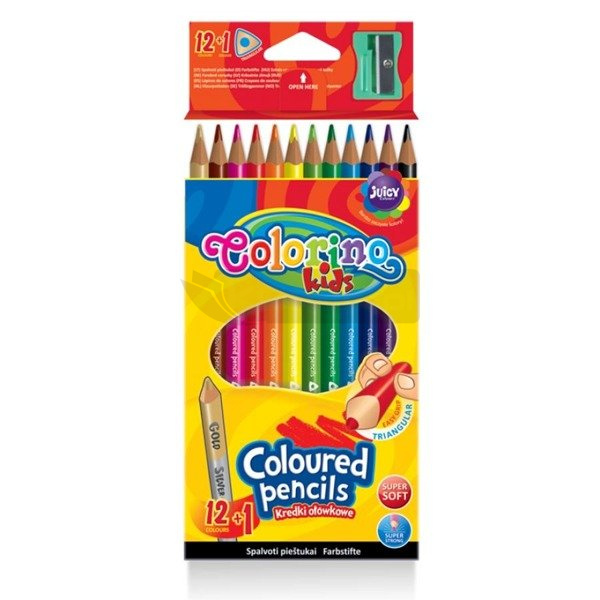 Trójkątne kredki Colorino Kids, tak jak wszystkie nasze kredki ołówkowe, posiadają niezwykle miękki rysik, dzięki któremu rysowanie to prawdziwa przyjemność. Dodatkową ich zaletą jest trójkątny, ergonomiczny kształt., który idealnie wpasowuje się w dłoń i zapewnia komfort rysowania. Zestaw 12 trójkątnych kredek ołówkowych wzbogacony o unikalną dwustronną kredką w odcieniach złota i srebra
