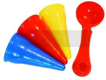 Zestaw trzech foremek w kształcie rożków lodowych, plus łyżka do nakładania gałek. Zestaw idealny do zabawy w piasku.